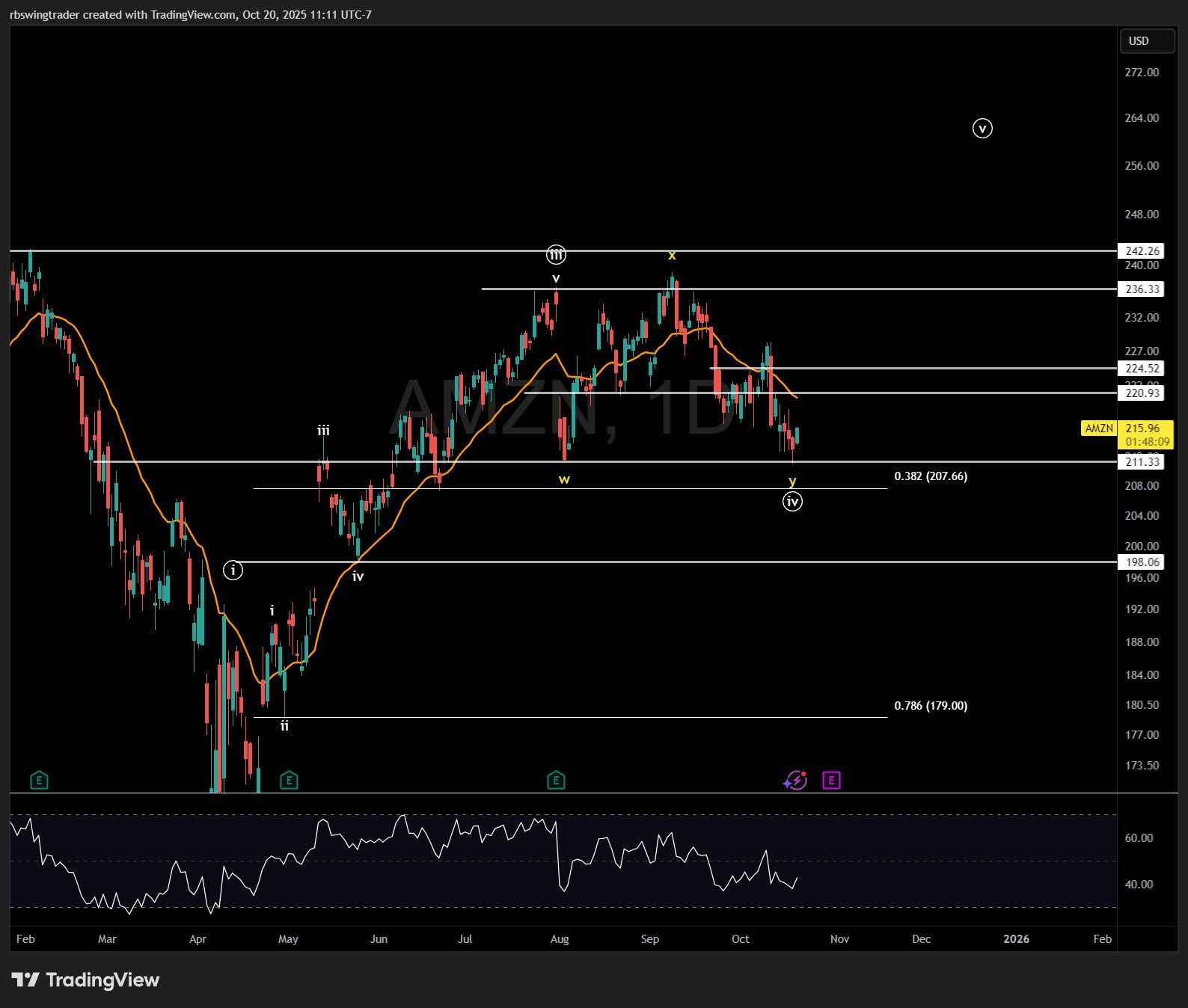 According to stock trader’s post on X, Amazon’s daily chart is finishing a pullback near the 0.382 Fibonacci level at $207.66. Price trades around $216, holding support at $211.