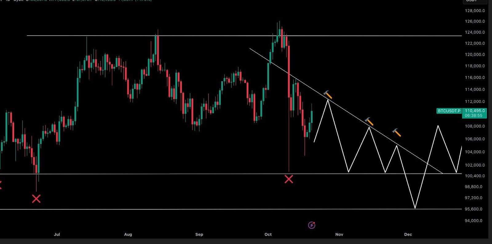 The pattern shows lower highs, with possible retests of $102K–$104K on rejection.