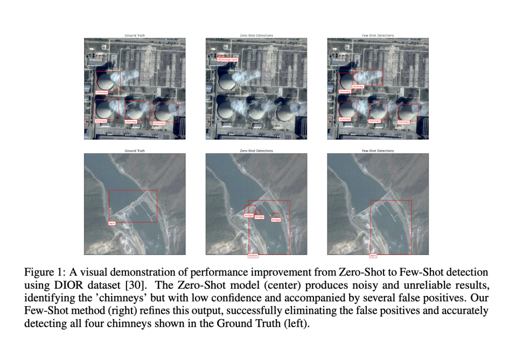 On 30 shot adaptation, FLAME cascaded on RS OWL ViT v2 reaches 53.96 percent AP on DOTA and 53.21 percent AP on DIOR, which is the top accuracy among the listed methods. The comparison includes SIoU, a prototype based method with DINOv2, and a few shot method proposed by the research team. These numbers appear in Table 1. The research team also reports the per class breakdown in Table 2. On DIOR, the chimney class improves from 0.11 in zero shot to 0.94 after FLAME, which illustrates how the refiner removes look alike false positives from the open vocabulary proposals.