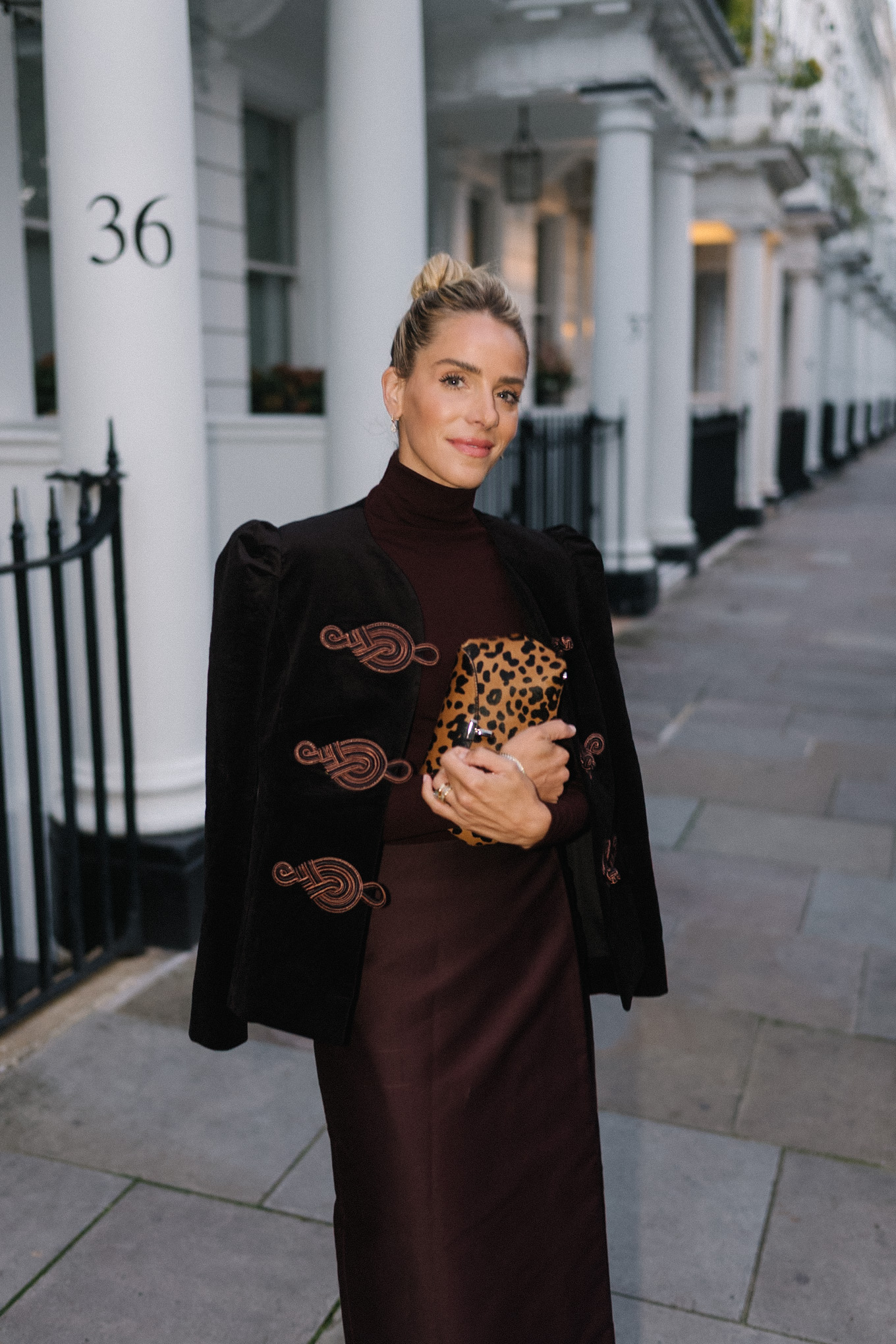Rosewater Jacket, Attersee Skirt, AG Turtleneck, Simon Miller Pumps, Toteme Clutch