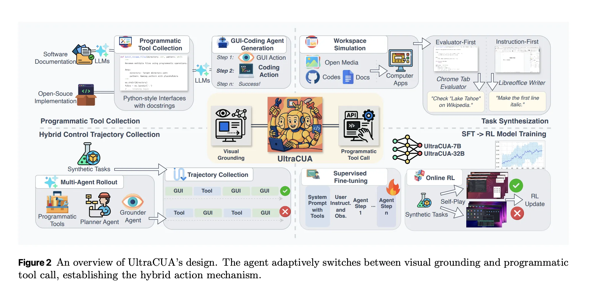 - UltraCUA formalizes a hybrid action space that lets a single agent alternate between GUI primitives and programmatic tool calls, which reduces long error prone action chains.
