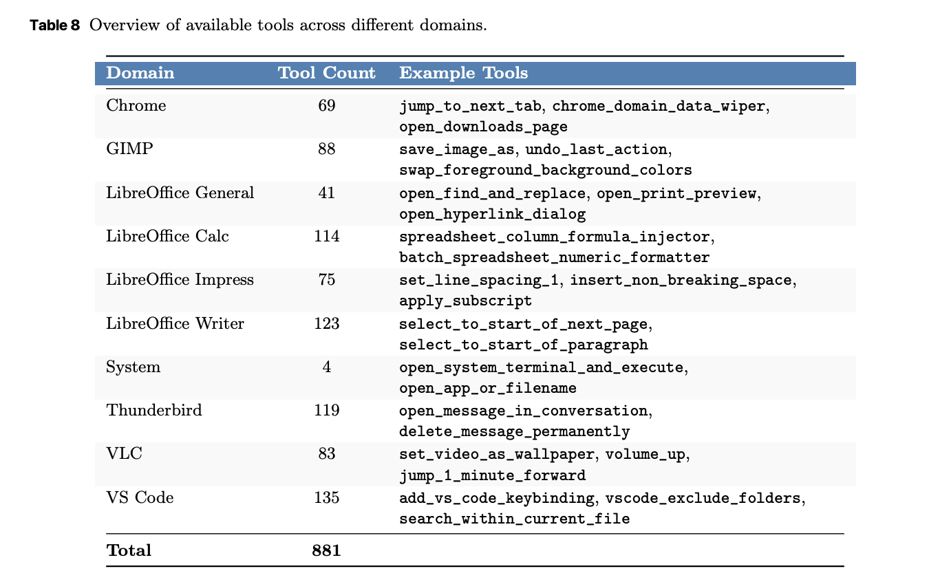 UltraCUA builds its tool library with an automated pipeline. The system extracts keyboard shortcuts and commands from software documentation. The system integrates open source implementations from agent toolkits. The system also uses coding agents to synthesize new tools. Each tool is a callable interface that hides a long GUI sequence. The research team reports coverage across 10 desktop domains with 881 tools. The largest buckets include VS Code with 135 tools and LibreOffice Writer with 123 tools. Thunderbird and GIMP also have deep coverage.