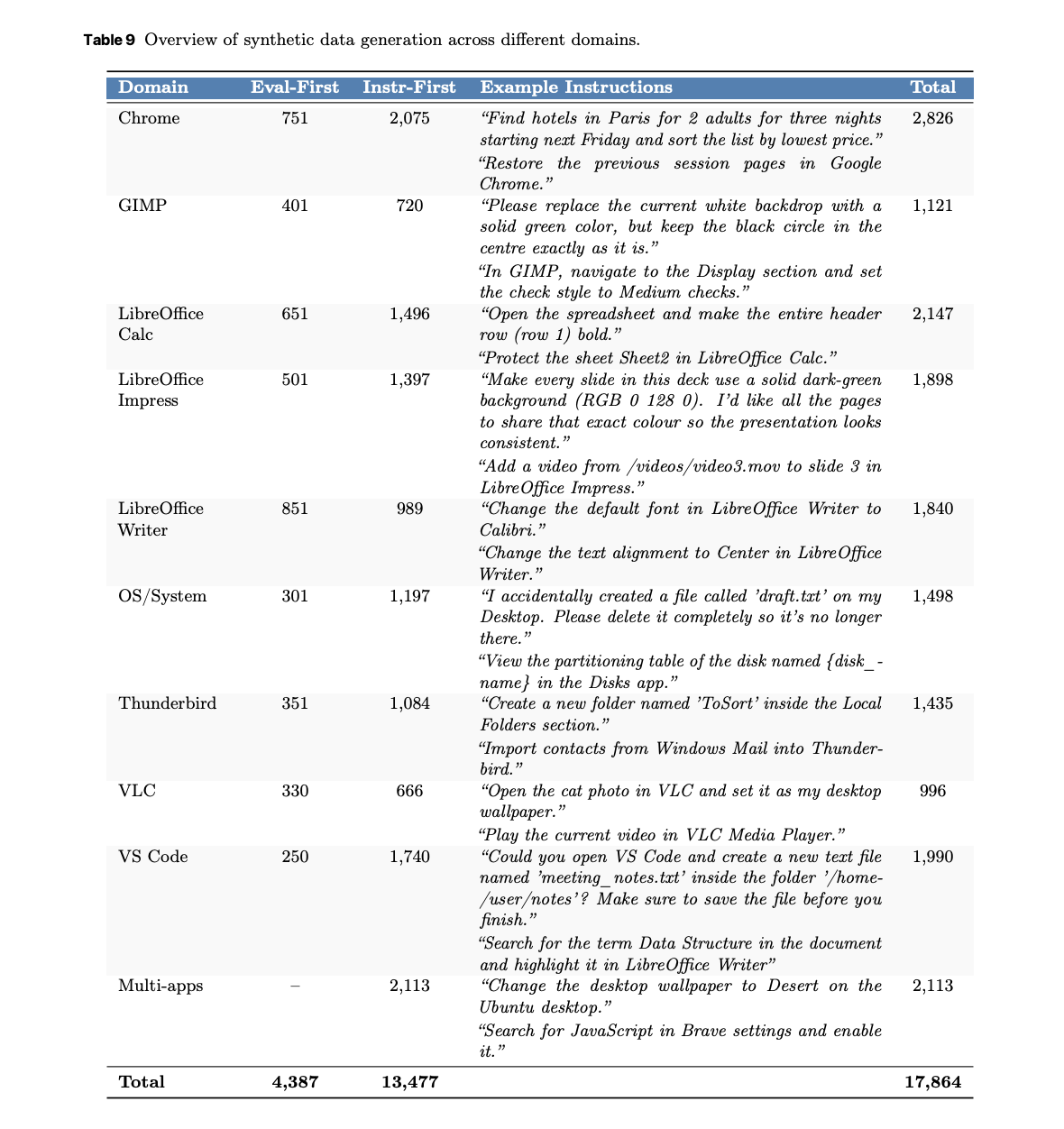 Training requires grounded supervision and stable rewards. UltraCUA uses a dual synthetic engine. An evaluator first pipeline composes atomic verifiers for browsers, files, images, and system state, then generates tasks that satisfy those checks. An instruction first pipeline explores the OS and proposes context aligned tasks which are then verified. The result is 17,864 verifiable tasks across 10 domains such as Chrome, LibreOffice, GIMP, VS Code, system, Thunderbird, VLC, and multi app workflows. Chrome has 2,826 tasks. The LibreOffice suite sums to 5,885 tasks. Multi app tasks reach 2,113.
