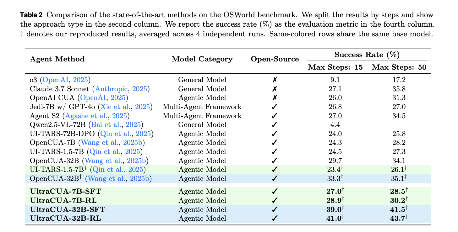 - On OSWorld, UltraCUA reports an average 22 percent relative improvement over base models and 11 percent fewer steps, which indicates gains in reliability and efficiency.