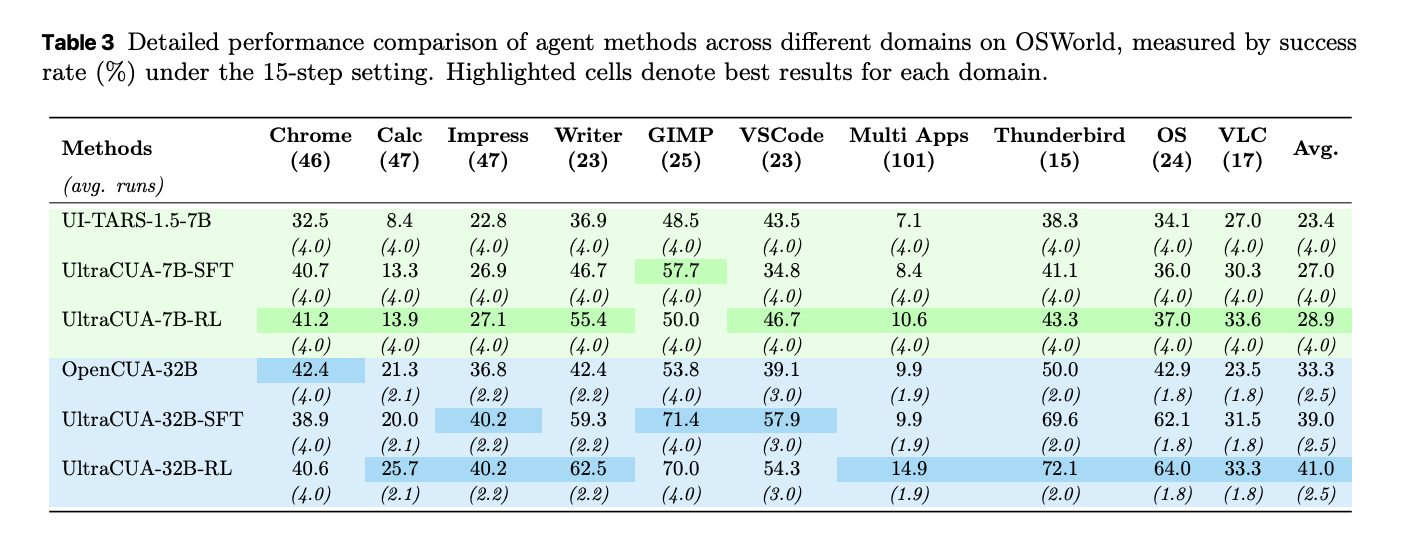 UltraCUA improves success at both 7B and 32B scales. Under 15 step budgets, UltraCUA-32B reaches 41.0 percent success. OpenCUA-32B reaches 29.7 percent. The absolute gain is 11.3 points. UltraCUA-7B reaches 28.9 percent. UI-TARS-1.5-7B reaches 23.4 percent. Gains persist under 50 step budgets. A per domain breakdown shows consistent lifts across Chrome, Writer, VS Code, and cross application tasks. Average steps decrease against baselines. These shifts indicate better action selection rather than only more attempts.