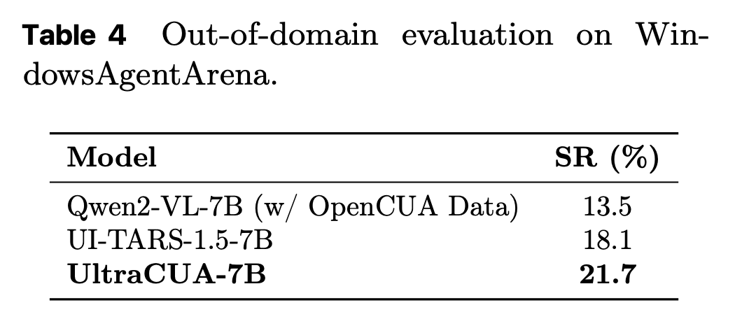 UltraCUA trains only on Ubuntu based OSWorld data. The model is then evaluated on WindowsAgentArena. UltraCUA-7B reaches 21.7 percent success. This exceeds UI-TARS-1.5-7B at 18.1 percent and a Qwen2 baseline trained with Windows data at 13.5 percent. The result suggests that hybrid action strategies learned on one platform transfer to other platforms. The paper highlights this as zero shot platform generalization.